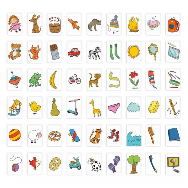 Place a 4 x 3 grid off tiles on the table, and form a deck. Players take turns drawing a tile from the deck, which they place in view on the table for all to see. The players must simultaneously find and share a logical link connecting the object shown in the image with one of the tiles in the grid. Players should look for similarities such as "they are all animals" or "they all start with the letter". When all players agree that an association has been made, they remove all tiles identified and then draw a new tile. When all the tiles are drawn and there are no more tiles left on the grid, they have collectively WON. If there are still tiles remaining on the grid, they have LOST.