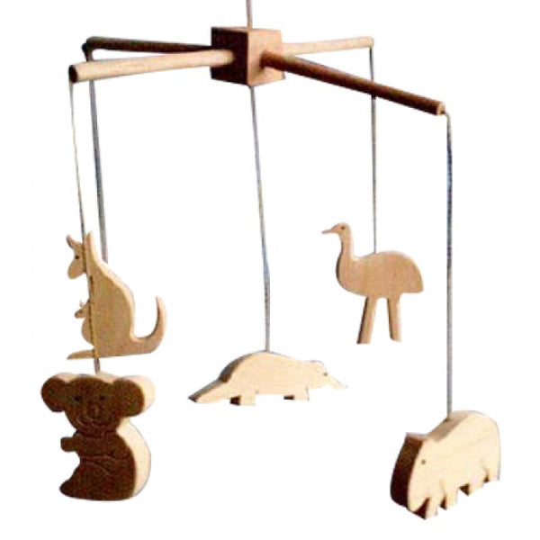 The natural Aussie wooden mobile features five friendly animals hanging from a secure cross bar. The animals include a kangaroo, emu, platypus, wombat and koala.